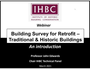 On 26 March the IHBC, led by Prof. John Edwards, hosted a free one-hour CPD webinar ‘Introduction to Building Survey for Retrofit’ for sector professionals – introducing the broad concepts of retrofit and relevant standards and guidance in advance of a more substantial programme later in the year, and it is now available on YouTube.