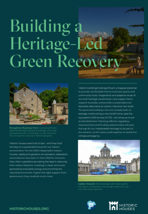 Membership and advocacy body Historic Houses reports on proposals for ‘Building a Heritage-Led Green Recovery’, including incentivising repair and reuse by reducing VAT on works to listed buildings.